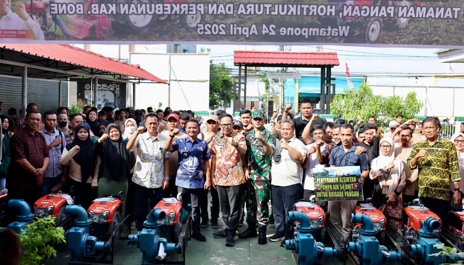 BONE–Bertempat di halaman Kantor Dinas Tanaman Pangan Hortikultura dan Perkebunan (TPHP) Kabupaten Bone, menjadi tempat strategis untuk memperkuat sektor pertanian kembali dilaksanakan. Bupati Bone H. Andi Asman Sulaiman, S.Sos., MM bersama Wakil Bupati Bone Dr. H. Andi Akmal Pasluddin, MM, Dandim 1407/Bone Letkol Inf. Moch. Rizky Hidayat Djohar, Direktur Polbantan Gowa Detia, dan Plt. Kadis TPHP Kabupaten Bone Nurdin, S.P., M.Si menyerahkan bantuan Alsintan berupa 54 unit pompa air kepada para brigade petani dalam rangka kegiatan Optimalisasi Lahan Rawa (Opla Rawa) Tahun 2024.