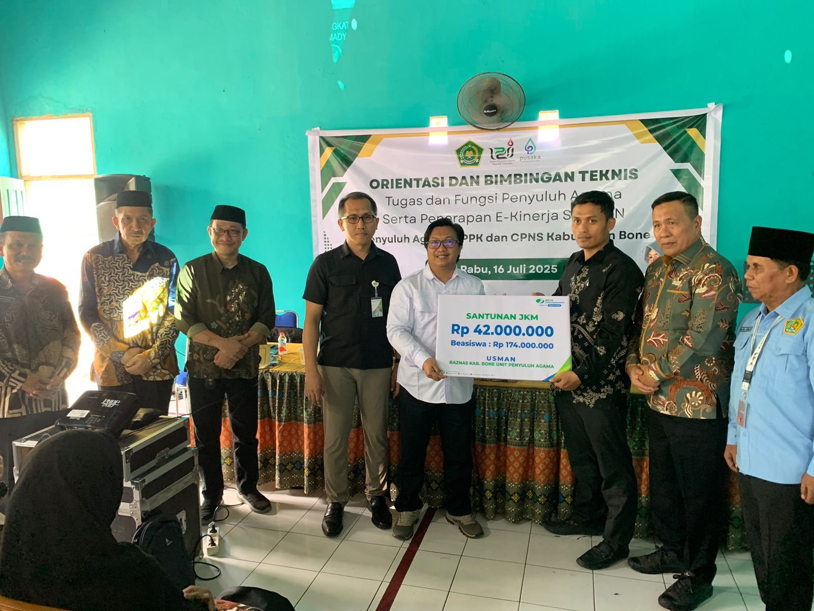 BONE–Suasana haru pada pelaksanaan Bimbingan Teknis (BIMTEK) Penyuluh Agama se-Kabupaten Bone. Di tengah rangkaian kegiatan peningkatan kapasitas tersebut, Badan Amil Zakat Nasional (BAZNAS) Kabupaten Bone bersama BPJS Ketenagakerjaan menyerahkan santunan duka kepada ahli waris almarhum Usman, penyuluh agama di KUA Kecamatan Tellu Siattinge yang wafat beberapa waktu lalu.
