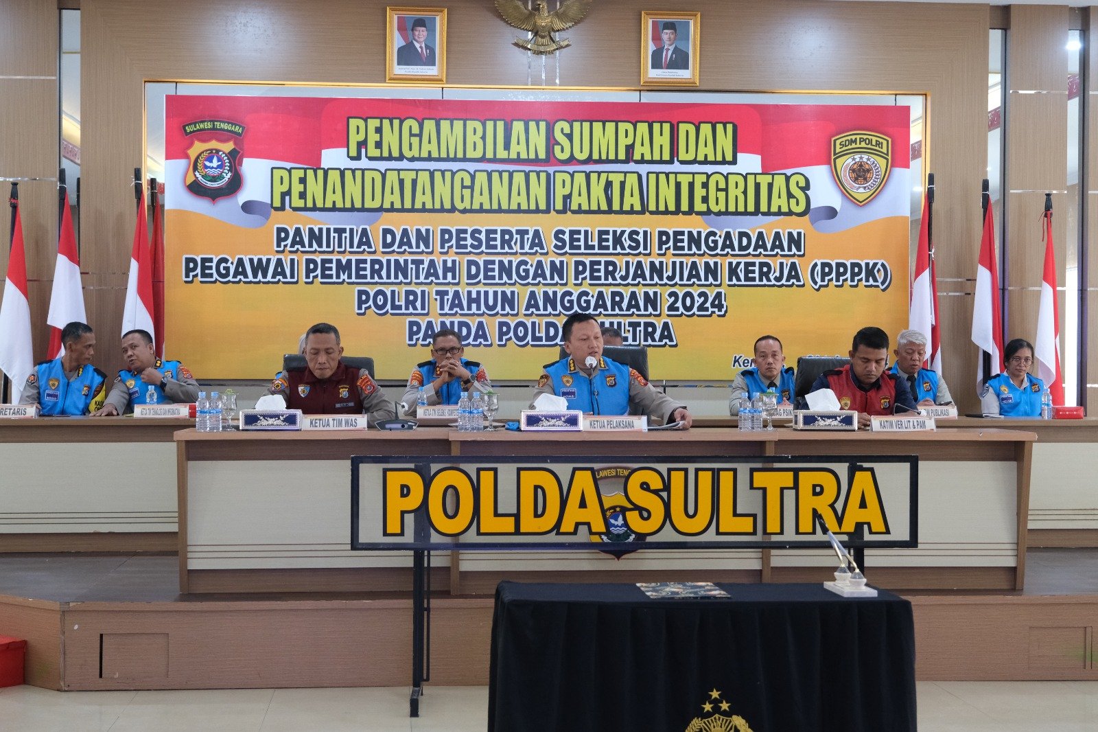 KENDARI – Biro Sumber Daya Manusia (SDM) Polda Sulawesi Tenggara (Sultra) melaksanakan Pengambilan Sumpah dan Penandatanganan Pakta Integritas dalam rangka Seleksi Pengadaan Pegawai Pemerintah dengan Perjanjian Kerja (PPPK) Polri Tahun Anggaran 2024. Acara tersebut berlangsung pada Senin, 28 Oktober 2024, di Aula Dachara Polda Sultra dan dihadiri oleh para peserta seleksi serta panitia rekrutmen.