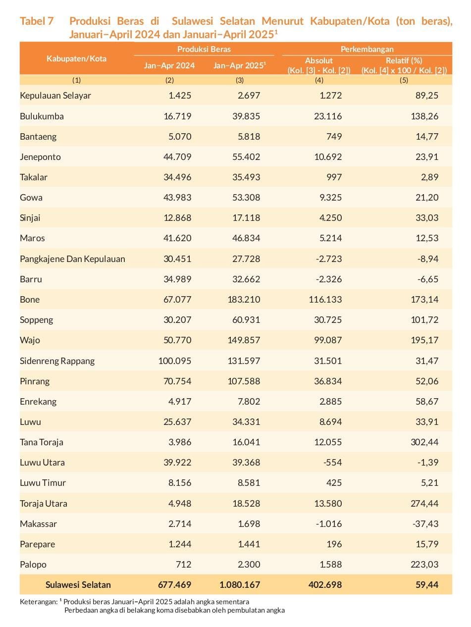 Pernyataan sang bupati bukan tanpa dasar. Data resmi Badan Pusat Statistik (BPS) Sulsel mencatat produksi gabah kering giling Kabupaten Bone sepanjang Januari hingga April 2025 mencapai 319.272 ton, melampaui kabupaten Sidrap yang selama ini dijuluki sebagai “raja gabah” di Sulsel. Sebagai perbandingan, produksi pada periode yang sama tahun lalu hanya mencapai 116.891 ton.