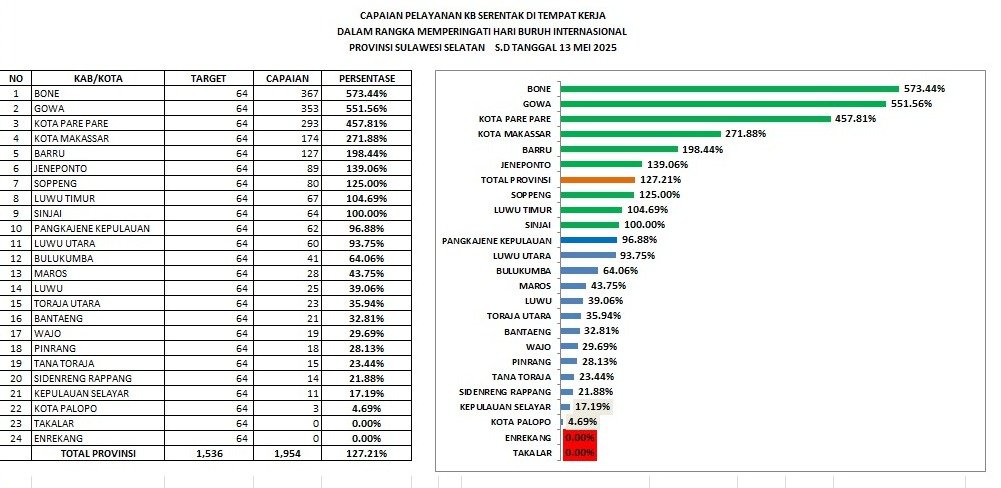 Kabupaten Gowa menyusul di posisi kedua dengan capaian 551,56%, sementara Parepare berada di peringkat ketiga dengan 457,81%. Hasil ini menunjukkan bahwa kesadaran akan pentingnya program KB di kalangan pekerja terus meningkat, terutama saat momentum peringatan Hari Buruh.