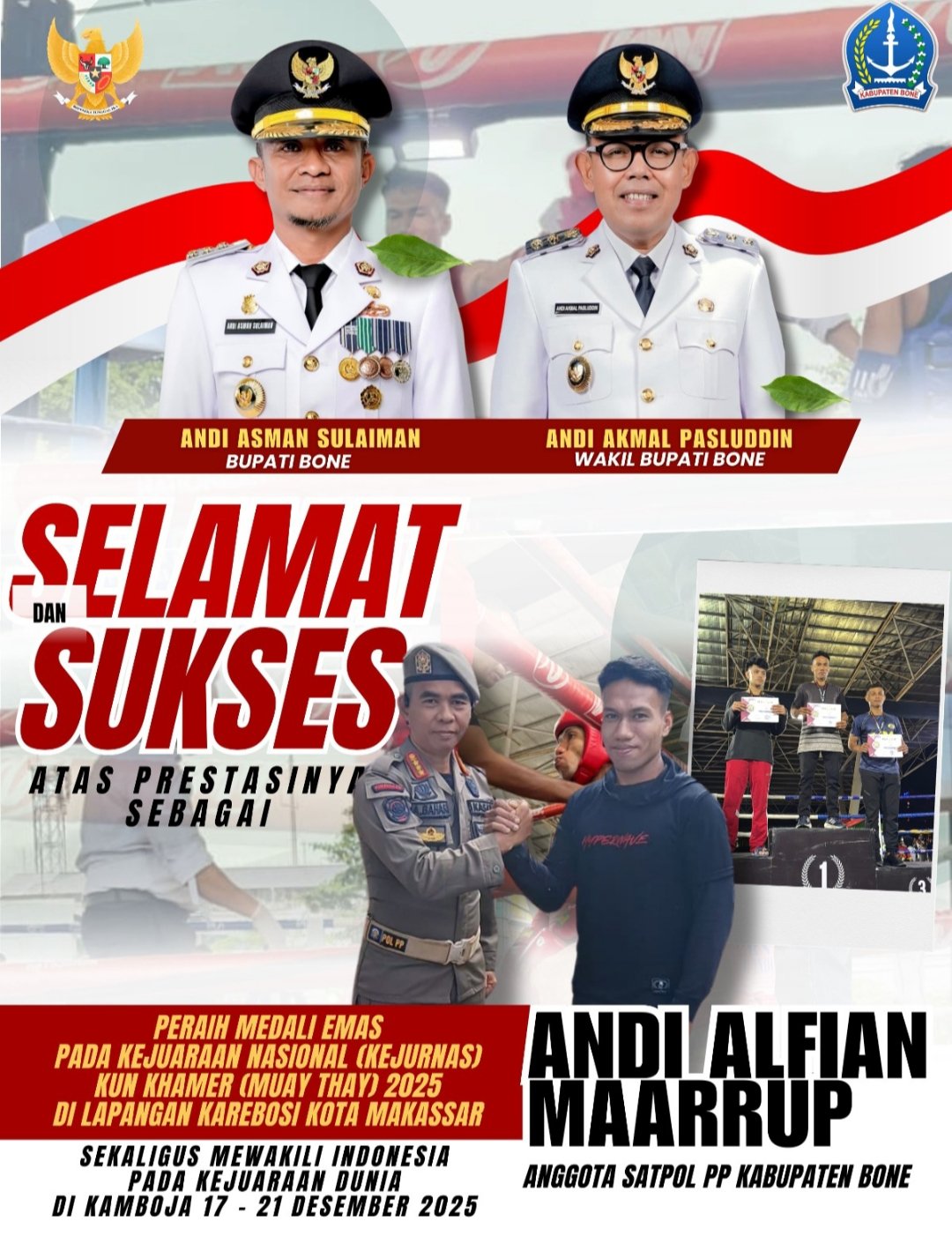 BONE–Prestasi membanggakan kembali ditorehkan putra daerah Kabupaten Bone. Andi Alfian Maarup, salah satu personel Satuan Polisi Pamong Praja (Satpol PP) Kabupaten Bone, sukses mengharumkan nama daerah setelah meraih medali emas pada Kejuaraan Nasional (Kejurnas) Khun Khamer Muay Thai yang digelar di Lapangan Karebosi, Makassar.