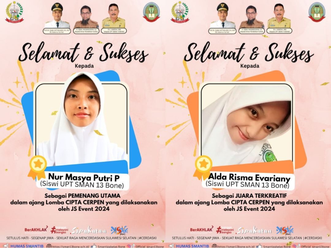BONE–Dua siswa SMAN 13 Bone berhasil menorehkan prestasi membanggakan dalam ajang Lomba Cipta Cerpen yang diselenggarakan oleh JS Event 2024. Alda Risma Evariany tampil gemilang dengan meraih penghargaan sebagai Juara Terkreatif, sementara Nur Masya Putri berhasil menjadi Pemenang Utama dalam lomba bergengsi tersebut.