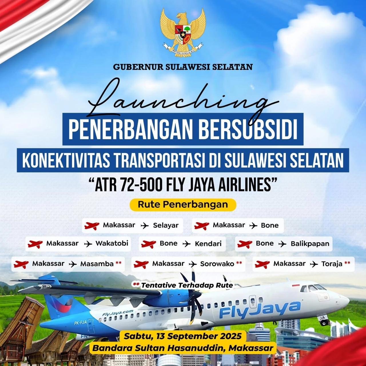 BONE–Pemerintah Provinsi Sulawesi Selatan terus menunjukkan komitmennya dalam meningkatkan konektivitas antarwilayah, khususnya melalui jalur udara. Sabtu, 13 September 2025, menjadi momen bersejarah Gubernur Sulawesi Selatan dijdwalkan meresmikan penerbangan bersubsidi dengan pesawat ATR 72-500 milik Fly Jaya Airlines di Bandara Sultan Hasanuddin, Kota Makassar.