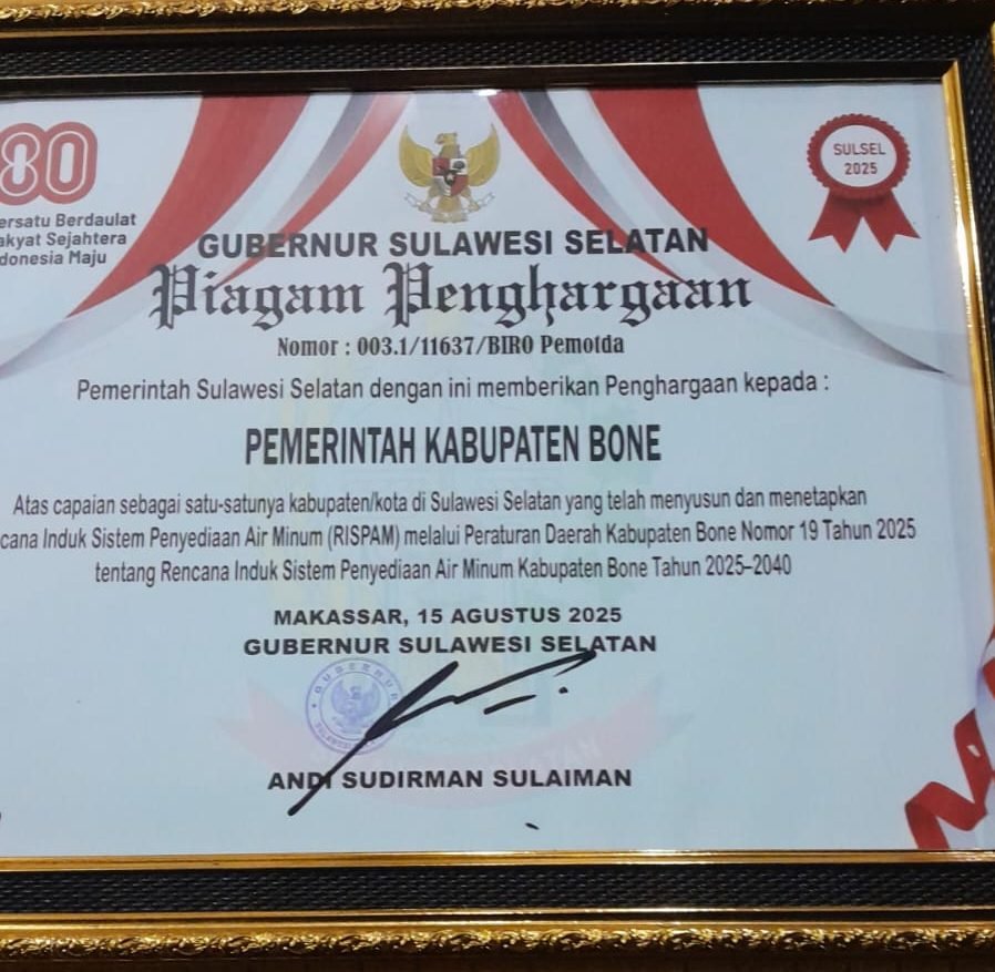 BONE – Kabupaten Bone kembali menorehkan prestasi membanggakan. Pada momentum peringatan Hari Ulang Tahun ke-80 Republik Indonesia, daerah berjuluk Bumi Arung Palakka ini mendapat penghargaan dari Pemerintah Provinsi Sulawesi Selatan. Bone dinobatkan sebagai satu-satunya daerah di Sulsel yang telah menetapkan Rencana Induk Sistem Penyediaan Air Minum (RISPAM) melalui Peraturan Daerah (Perda) Nomor 19 Tahun 2025 tentang Rencana Induk Sistem Penyediaan Air Minum Kabupaten Bone Tahun 2025–2040.