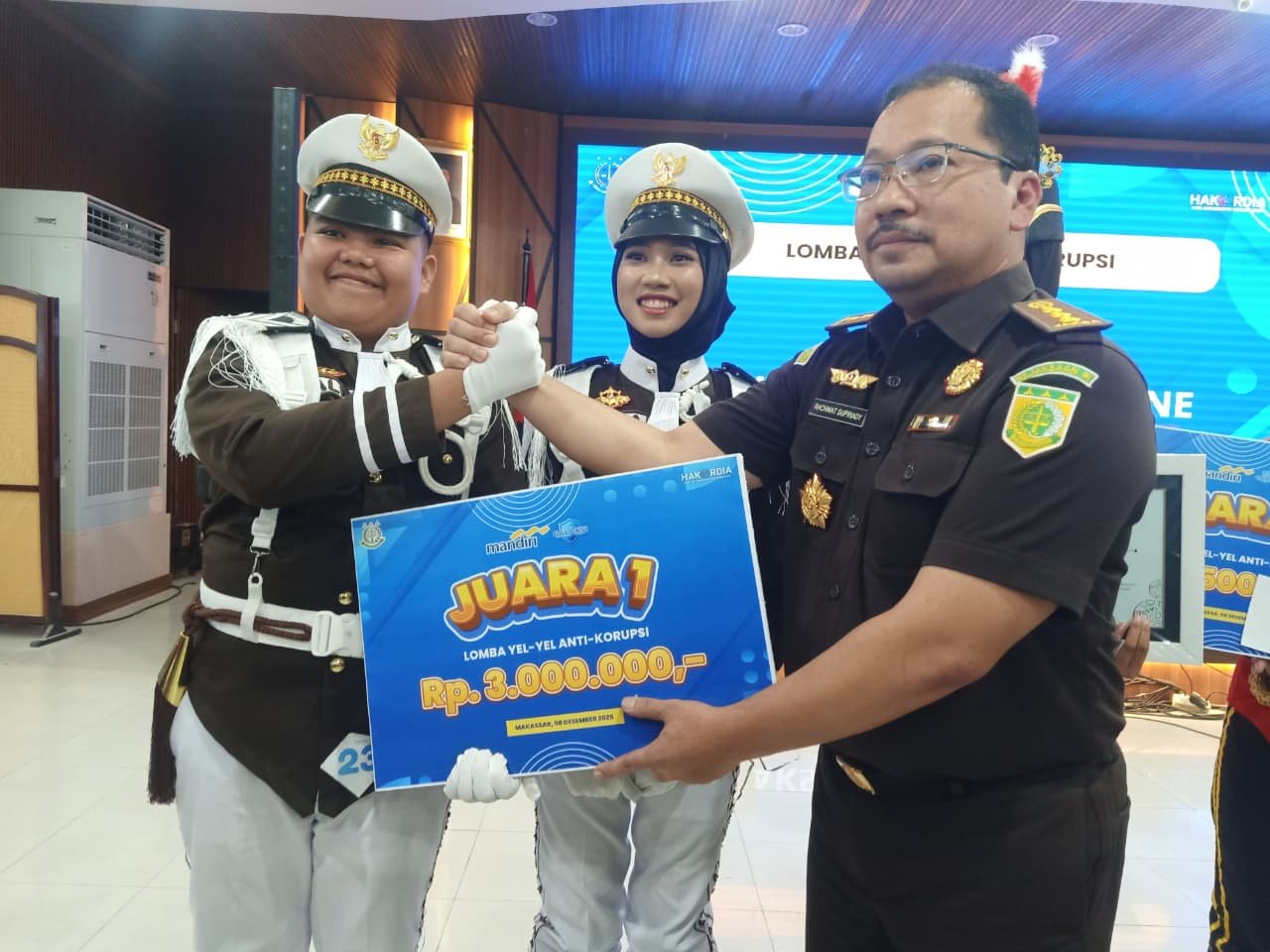 MAKASSAR — Semangat anti korupsi kembali menggema dari Kabupaten Bone. Dalam rangka peringatan Hari Anti Korupsi Sedunia (HAKORDIA) tahun 2025, Kejaksaan Negeri Bone menunjuk SMP Negeri 1 Watampone sebagai perwakilan dalam lomba yel-yel anti korupsi yang digelar di Kejaksaan Tinggi Sulawesi Selatan, Senin (8/12/2025). Kepercayaan ini tidak disia-siakan. SMPN 1 Watampone tampil memukau dan berhasil meraih Juara 1, mengungguli 23 Kejari lainnya se-Sulawesi Selatan.