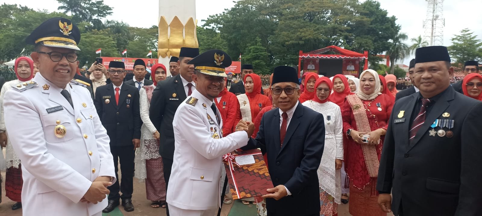 Penyerahan tersebut berlangsung penuh khidmat, menyusul iringan suasana kebangsaan yang masih terasa kuat. Turut mendampingi Bupati Bone, Wakil Bupati Bone Dr. H. Andi Akmal Pasluddin, MM serta Kepala Dinas Pemukiman, Pertanahan, dan Perkebunan Kabupaten Bone, Budiono, S.Sos., M.Si.