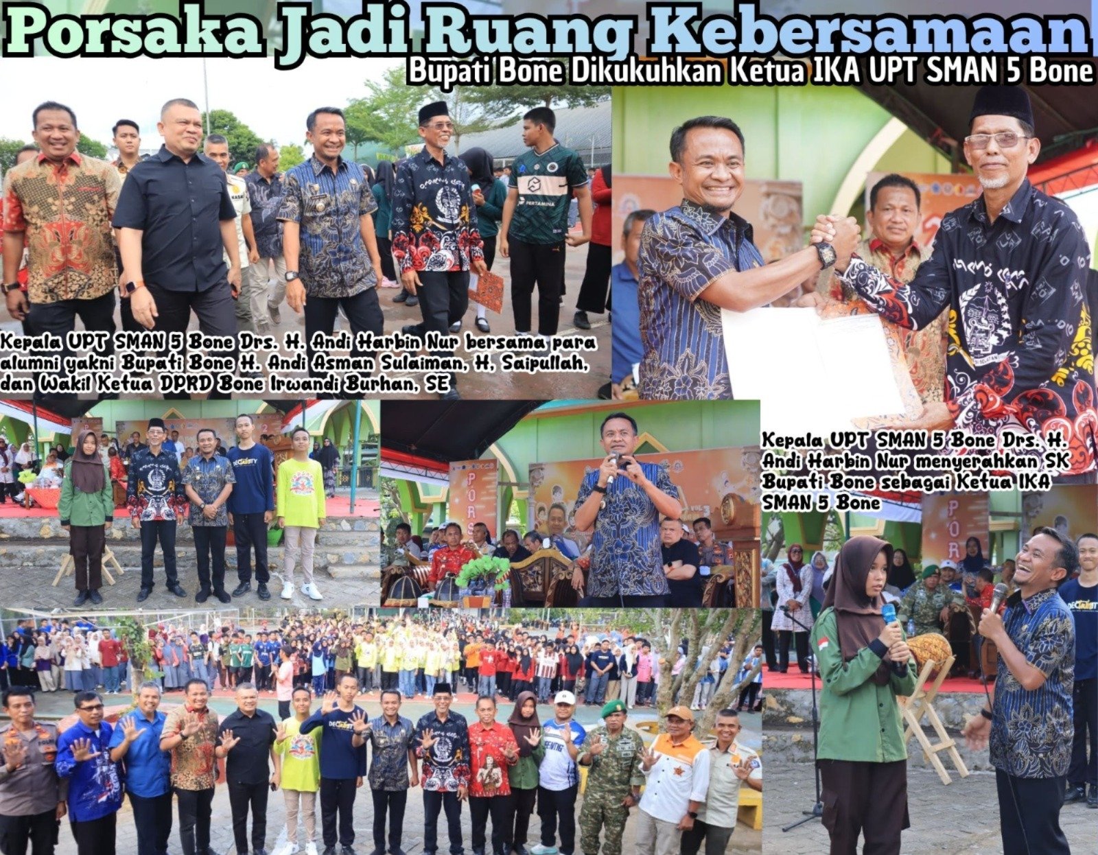 Di tengah semarak gelaran Pekan Olahraga, Seni, dan Kepramukaan (Porsaka) SMA 5 Bone, terselip pesan hangat sekaligus reflektif dari Bupati Bone H. Andi Asman Sulaiman. Tak sekadar hadir membuka kegiatan, ia juga berdiri sebagai bagian dari keluarga besar alumni mengemban amanah baru sebagai Ketua Ikatan Alumni (IKA) SMA 5 Bone.