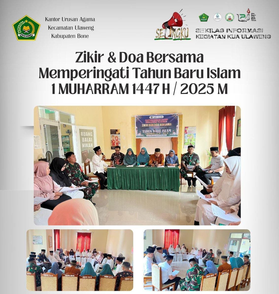 BONE — Suasana khidmat dan penuh kekhusyukan mewarnai pelaksanaan dzikir dan doa bersama dalam rangka menyambut Tahun Baru Islam 1 Muharram 1447 Hijriah yang digelar oleh Kantor Urusan Agama (KUA) Kecamatan Ulaweng, Kamis (26/6).