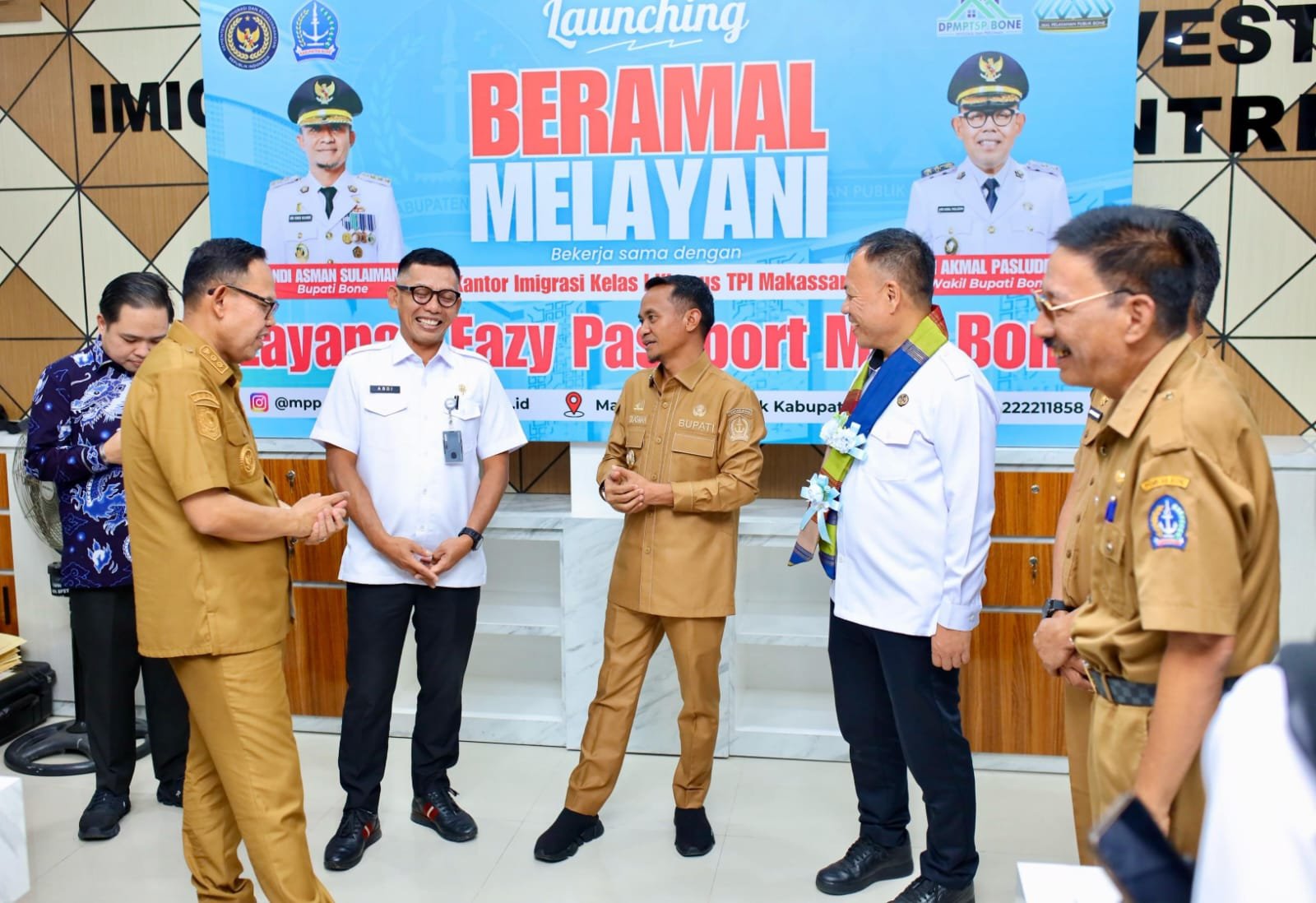 Turut hadir dalam acara ini, Kepala Kantor Imigrasi Kelas I TPI Makassar, Abdi Widodo Subagyo, serta tim dari Kementerian Imigrasi dan Pemasyarakatan (Kemenimipas) RI. Kehadiran mereka menandai peresmian program Beramal Melayani, sebuah inisiatif kerja sama antara Kantor Imigrasi Kelas I Khusus TPI Makassar dengan MPP Bone. Salah satu layanan unggulan yang diperkenalkan adalah Eazy Passport, yang memudahkan masyarakat Bone dalam mengurus paspor tanpa harus ke Makassar.