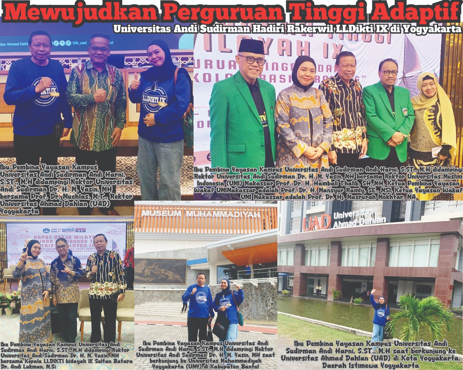 Yogyakarta–Di tengah semangat meningkatkan mutu pendidikan tinggi, Ibu Pembina Yayasan Kampus Universitas Andi Sudirman (Uniasman), Andi Harni, S.ST., M.H, bersama Rektor Universitas Andi Sudirman, Dr. H. M. Yasin, MH, turut ambil bagian dalam Rapat Kerja Wilayah (Rakerwil) Lembaga Layanan Pendidikan Tinggi (LLDikti) Wilayah IX. Acara ini berlangsung di SM Tower Malioboro Yogyakarta, dari Senin hingga Kamis, 10-13 Februari 2025.