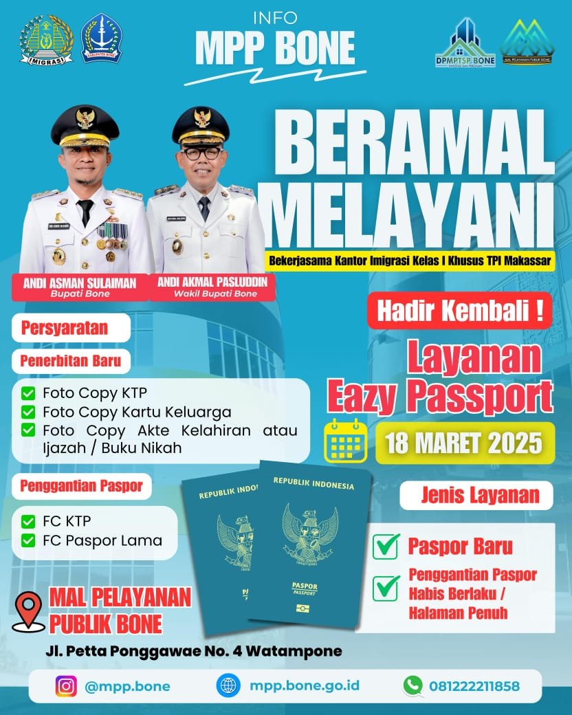 BONE–Mal Pelayanan Publik (MPP) Pemerintah Kabupaten Bone terus berupaya memberikan layanan terbaik bagi masyarakat. Di bawah kepemimpinan Bupati Bone, Andi Asman Sulaiman, dan Wakil Bupati Bone, Andi Akmal Pasluddin (pasangan Beramal), MPP kembali menghadirkan layanan pengurusan paspor bagi warga Bone.