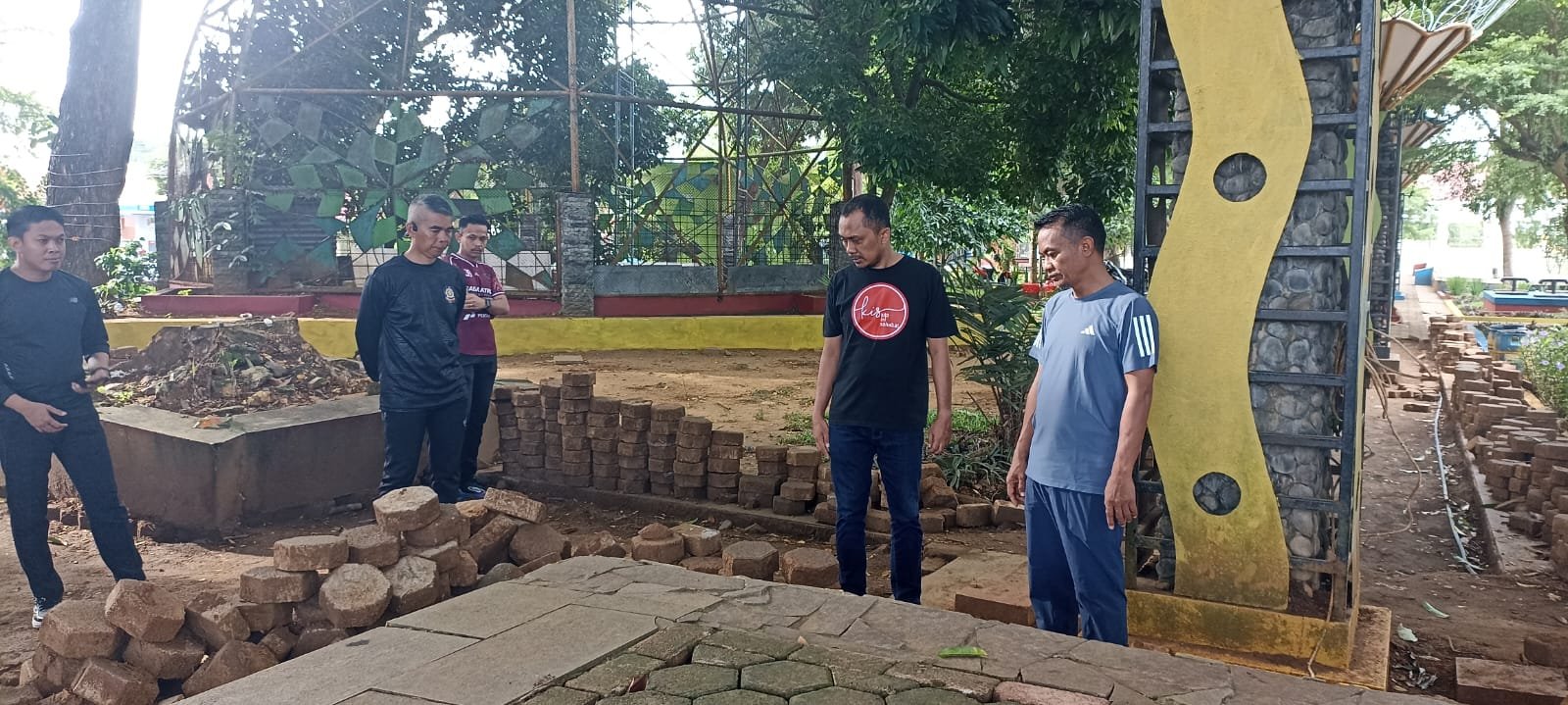 Sesampainya di area taman, Bupati Asman terlihat berhenti sejenak, memperhatikan detail pengerjaan yang sedang berlangsung. Ia kemudian memanggil Kabid Tata Lingkungan Dinas Lingkungan Hidup, Andi Habibie, untuk memastikan proses pembenahan berjalan sesuai harapan.