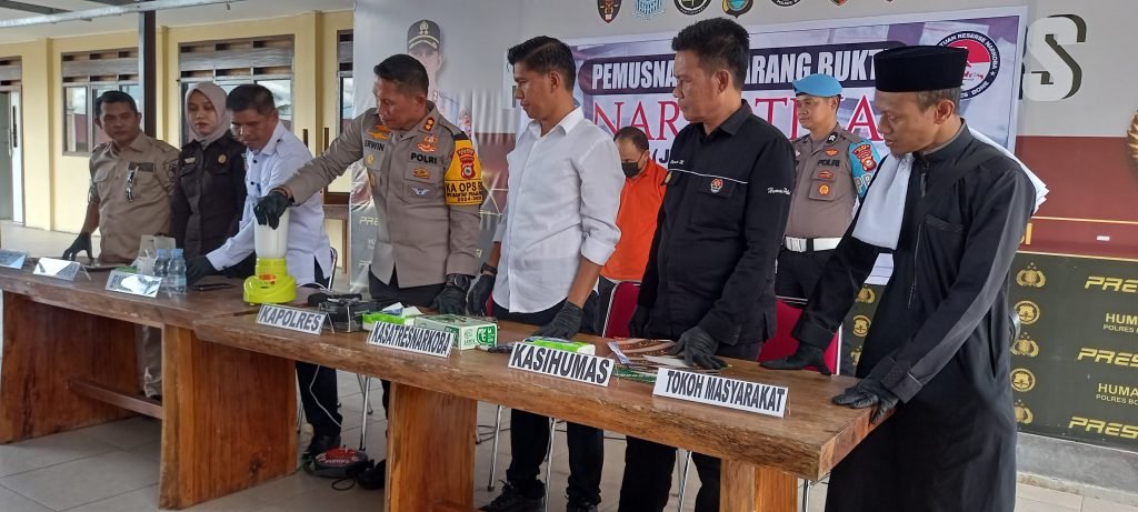 BONE–Momen bersejarah pemusnahan barang bukti narkoba jenis sabu jaringan internasional Malaysia senilai Rp 420 juta Senin, 02 Desember 2024. Prosesi ini dipimpin langsung oleh Kapolres Bone, AKBP Erwin Syah, dan dihadiri berbagai pihak, mulai dari Kejaksaan Negeri Bone, Badan Narkotika Nasional Kabupaten (BNNK) Bone, penasihat hukum, hingga tokoh masyarakat setempat.