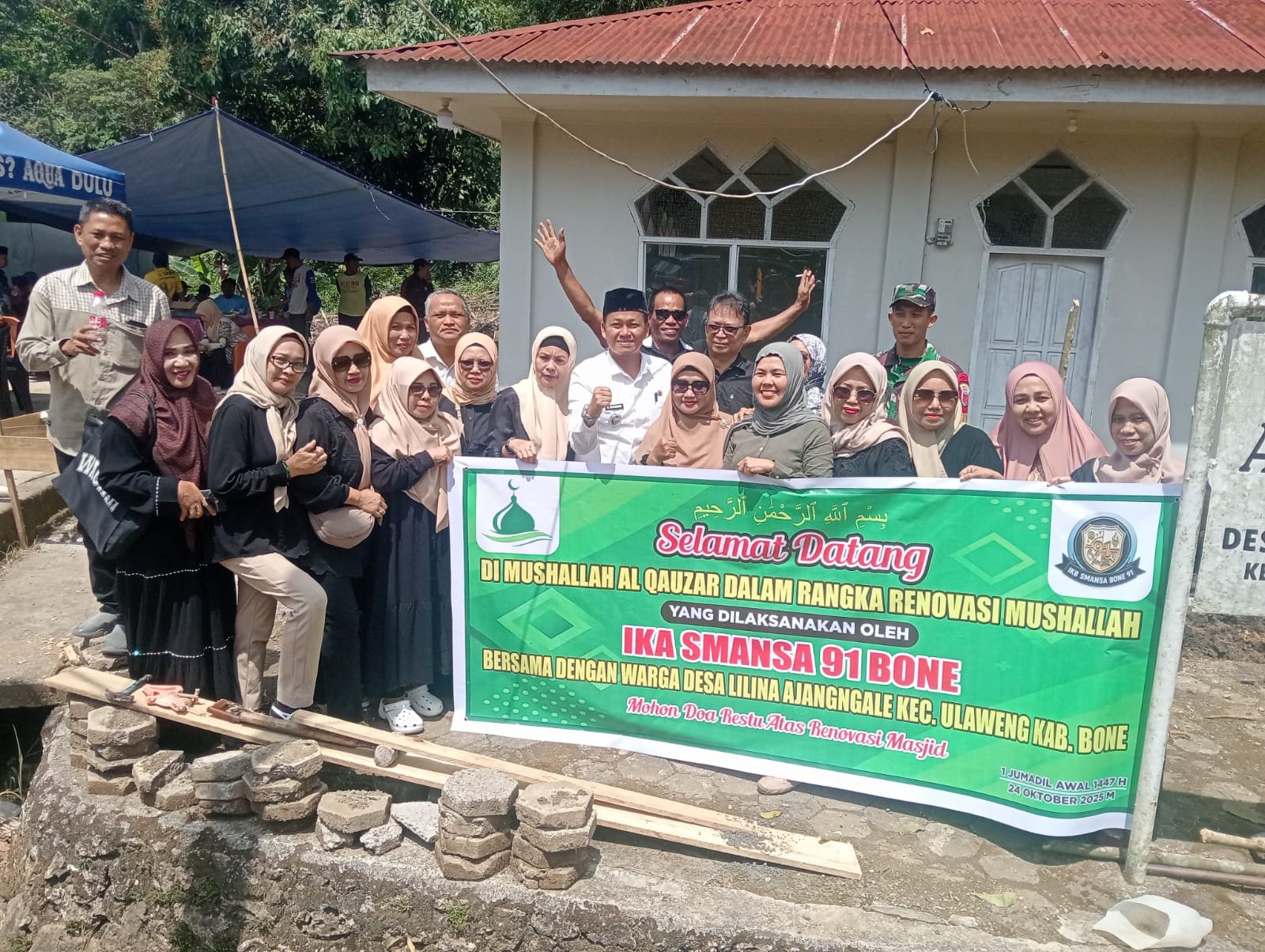BONE — Suara palu dan tawa warga berpadu di antara tembok Mushalla Al-Qauzar, Desa Lilina Ajangngale, Kecamatan Ulaweng. Di bawah terik matahari, para alumni SMAN 1 Bone angkatan 1991 (IKA SMANSA 91 Bone) bekerja bahu membahu bersama masyarakat setempat Jumat, 24 Oktober 2025. Tak sekadar merenovasi bangunan ibadah, kegiatan ini menjadi wujud nyata semangat gotong royong dan kepedulian sosial yang tumbuh dari hati para alumni.