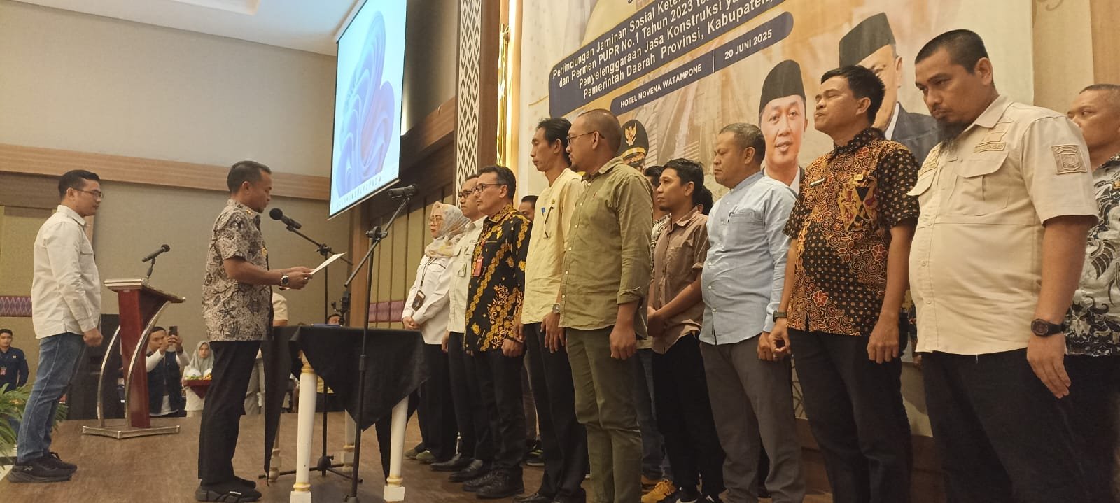 BONE – Bertempat di ballroom Hotel Novena Pemerintah Kabupaten Bone melalui Dinas Sumber Daya Alam dan Bina Konstruksi menggelar momen penting: Pengukuhan Satuan Tugas Bina Jasa Konstruksi Kabupaten Bone, yang dirangkaikan dengan Sosialisasi Perlindungan Jaminan Sosial Ketenagakerjaan Sektor Jasa Konstruksi dan penjelasan mengenai Permen PUPR No. 1 Tahun 2023 tentang Pedoman Pengawasan Penyelenggaraan Jasa Konstruksi Jumat, 20 Juni 2025.