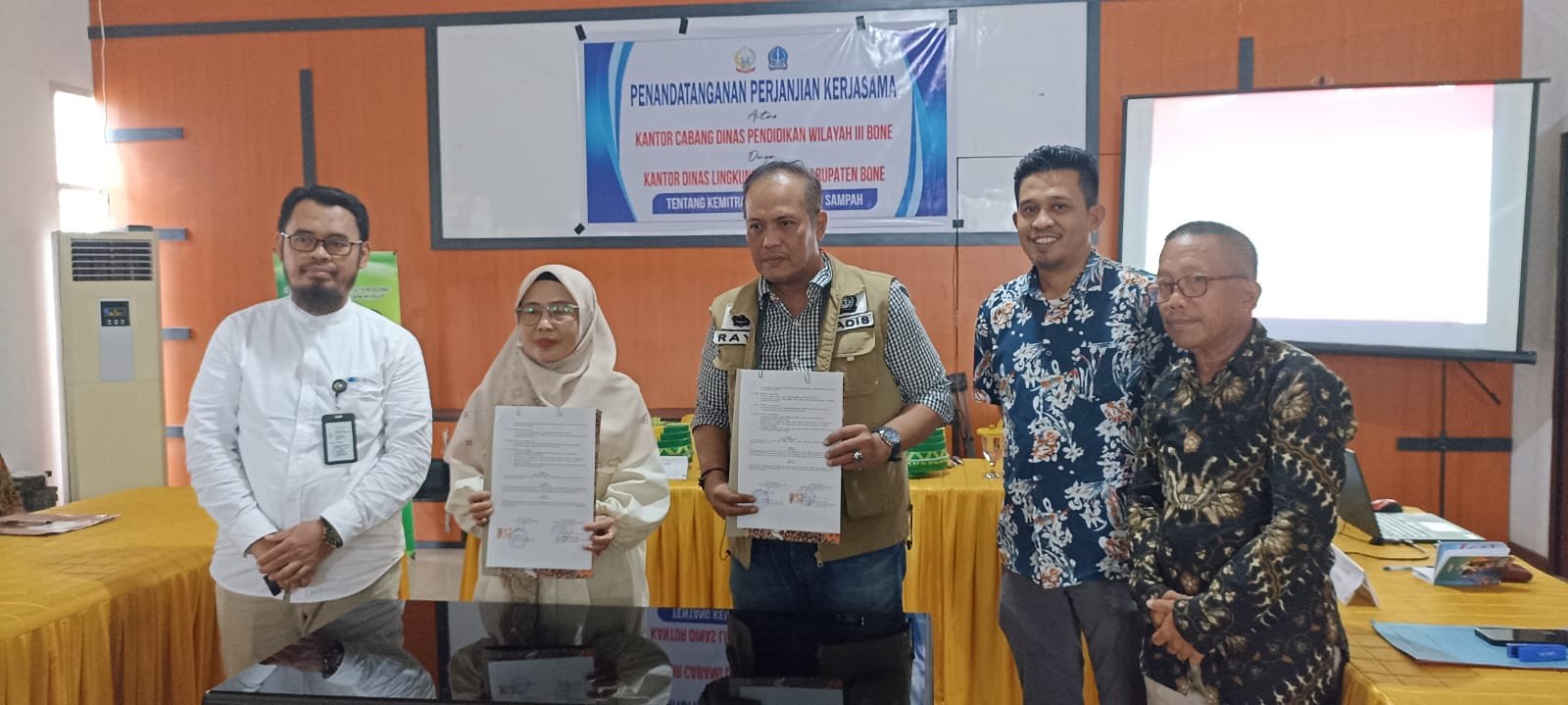 BONE–Penandatanganan Perjanjian Kerja Sama antara Kantor Cabang Dinas Pendidikan Wilayah III Bone dengan Kantor Dinas Lingkungan Hidup Kabupaten Bone tentang kemitraan pengelolaan sampah resmi dilaksanakan di Kantor DLH Bone, Jumat (4/7/2025).