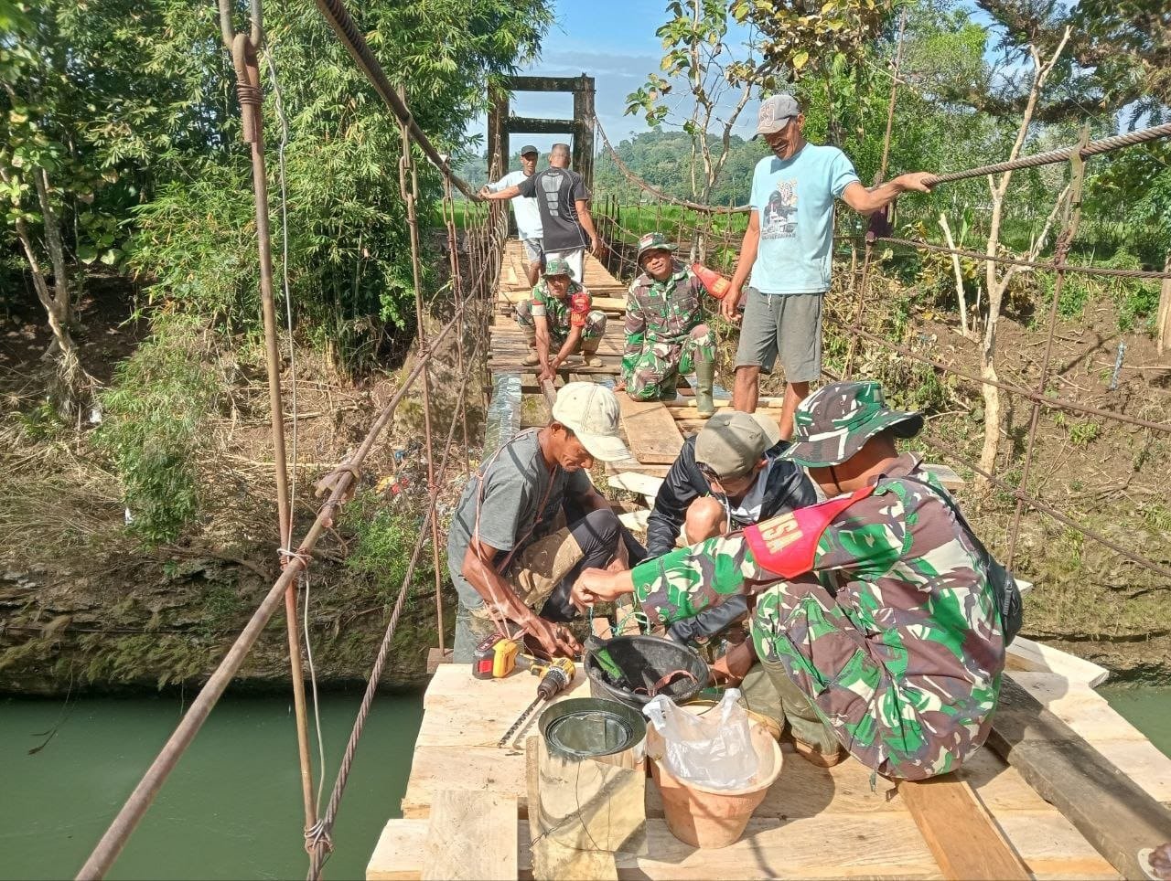 Bone — Pasca terjadinya bencana banjir yang melanda wilayah Mare, jajaran Koramil 1407-15/Mare di bawah pimpinan Danramil Mare, Kapten Inf Muh. Arsyad, bergerak cepat memulihkan infrastruktur vital yang terdampak. Melalui kegiatan karya bakti, prajurit TNI bersama warga bahu membahu memperbaiki Jembatan Gantung di Dusun Belawae dan Dusun Lagusi, Desa Ujung Tanah, Kecamatan Mare, Kabupaten Bone, Selasa (8/7/2025).